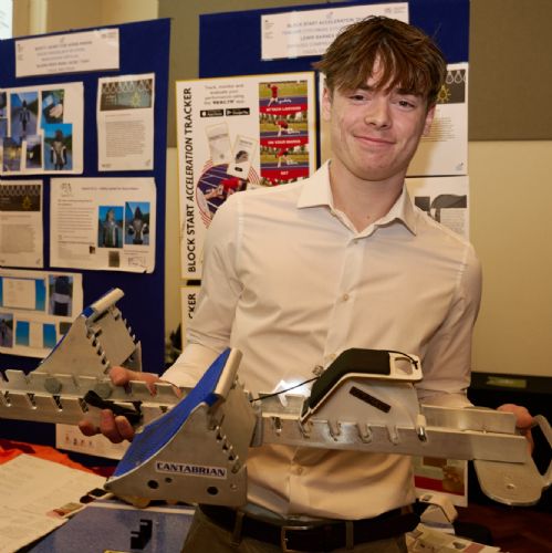 Huge congratulations to Lewis Barnes (y13) on winning the overall prize and the AS prize at the WJEC Innovation Awards in Cardiff today. His block start acceleration trainer combining his passions for Product Design and sport certainly wowed the judges.