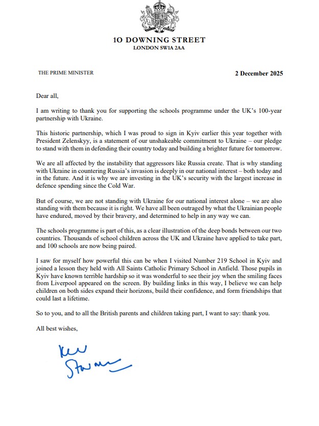 Exciting news! We have received a letter from the UK Prime Minister, recognising UK schools involved in the partnership programme for their morale-boosting role. |